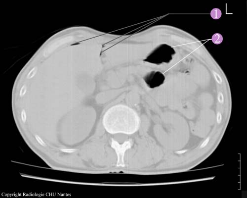 Examen tomodensitométrique LÉGENDES: 1.Air en avant du foie et dans le sillon du ligament rond. 2. Air dans le colon ( c’est normal ). Il faut savoir que l’ASP était normal, donc il faut être vigilant. Pour retourner à l'image initiale, cliquez ICI. |