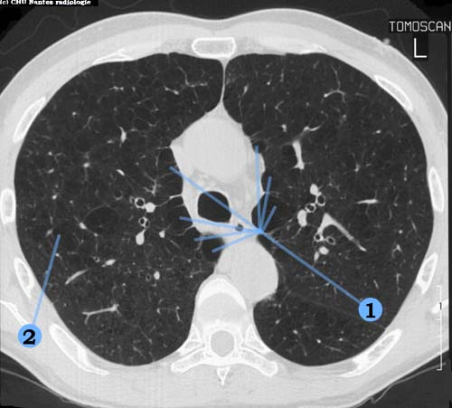 2 . emphysème pulmonaire avec de multiples zones d'hyperclartés parenchymateuses bilatérales ( aériques ) disséminées |