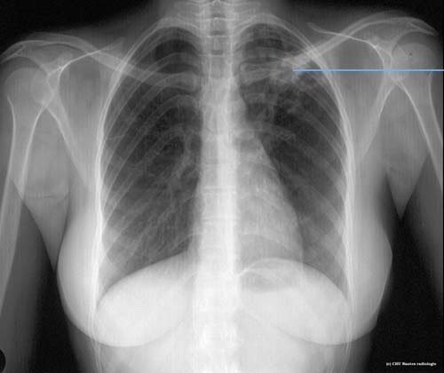 Opacités à bords flous , mal limitée et à centre clair aérique : caverne d'origine tuberculeuse ( lésion excavée ) du lobe supérieur gauche