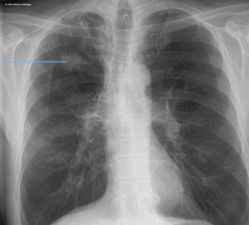Opacité solide aux contours spiculaires suspecte de tumeur pulmonaire primitive du lobe supérieur droit
