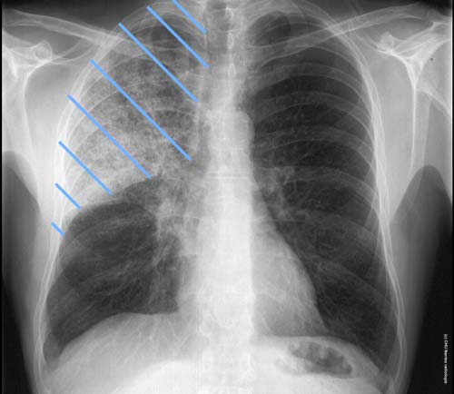 Syndrome interstitiel en rayon de miel du lobe supérieur droit (lymphagite carcinomateuse)